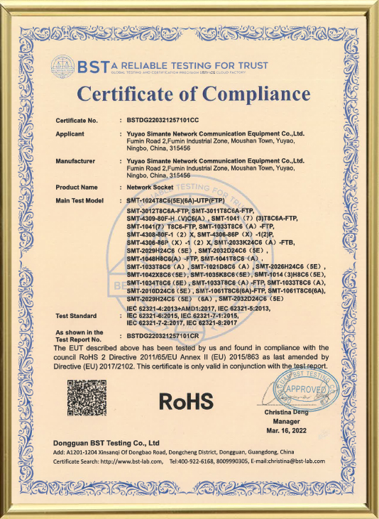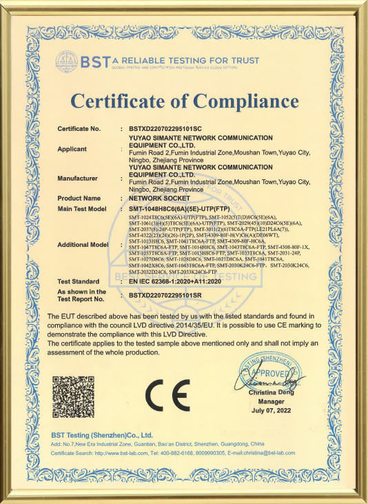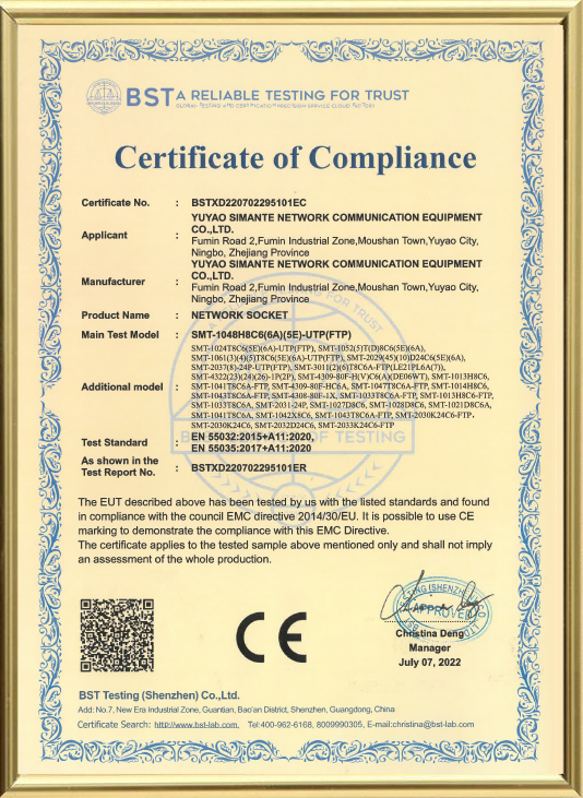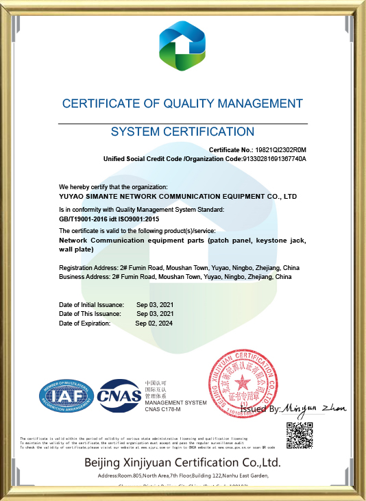 Yuyao Simante Network Communication Equipment Co., Ltd. est un fabricant professionnel de solutions de câblage réseau et de produits à fibre optique intégrant la conception, le développement, la vente et le service.