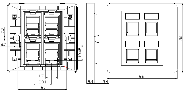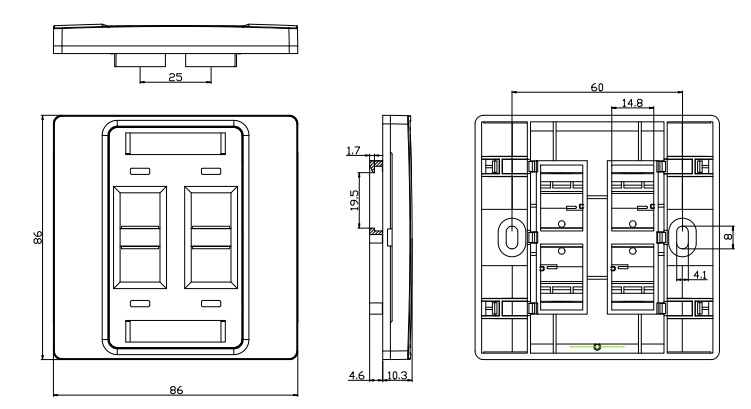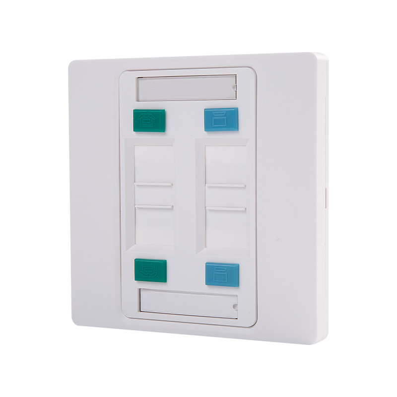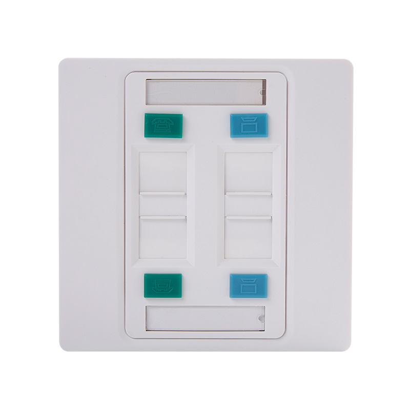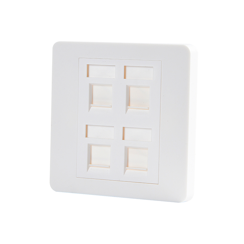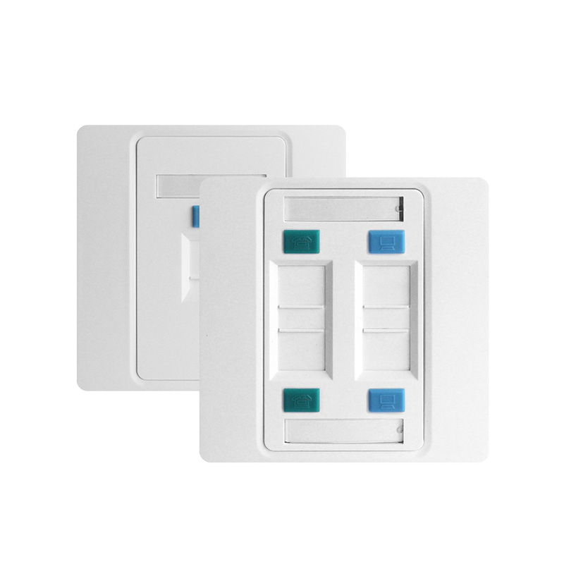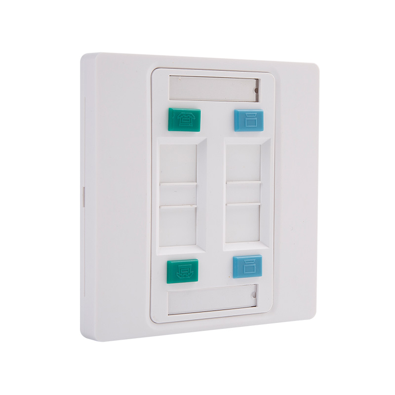 La plaque de face est généralement montée sur une boîte électrique murale ou surface, offrant une apparence propre et professionnelle tout en gardant les connexions facilement accessibles. Les ports de la plaque de face peuvent être utilisés pour connecter des appareils tels que les ordinateurs, les téléphones, l'équipement de mise en réseau ou les appareils audiovisuels, selon le type de ports installés.