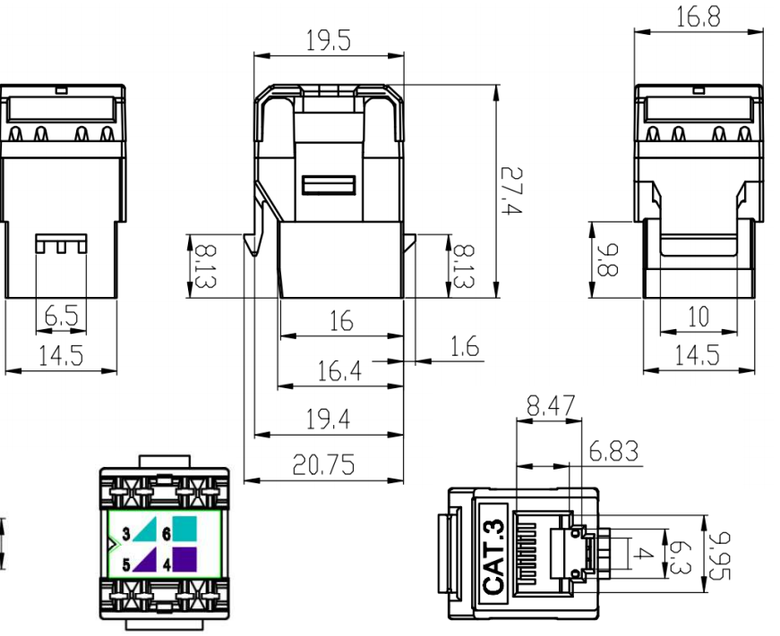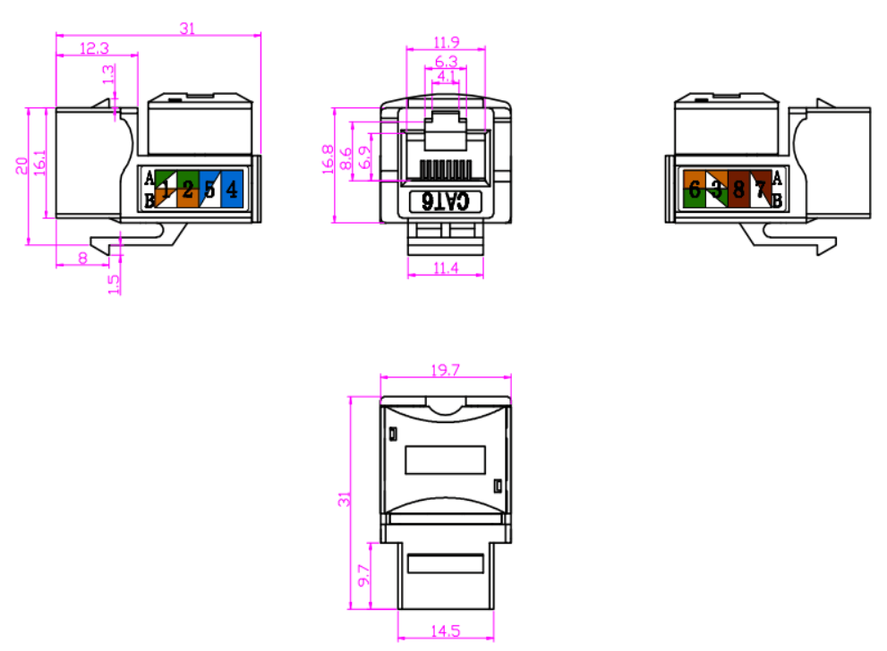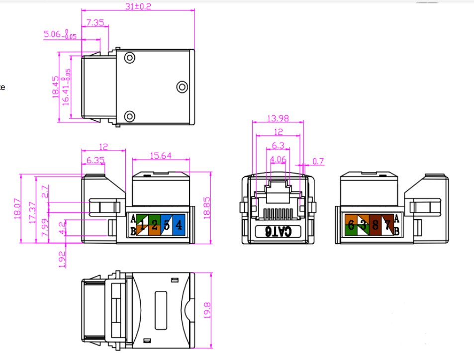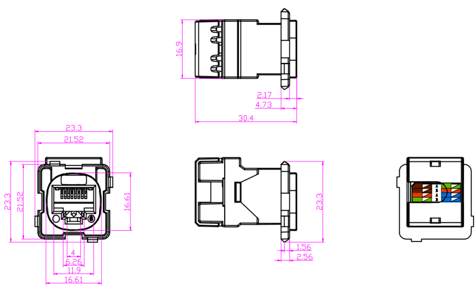 Codage des couleurs: les prises Keystone présentent souvent des schémas de câblage à code couleur pour assurer un bon alignement et une terminaison des câbles de cuivre. Le codage couleur suit les normes de l'industrie, telles que T568A ou T568B, pour maintenir la cohérence et la compatibilité au sein du système de câblage.