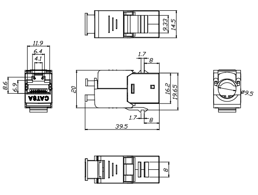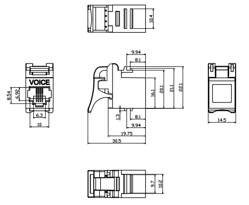 Le terme "keystone" fait référence à la taille et à la forme de la prise, qui est conçue pour s'adapter à une ouverture ou à une fente correspondante appelée plaque murale ou panneau de patch Keystone. Les prises Keystone sont disponibles dans diverses configurations pour prendre en charge différents types de câblage en cuivre, tels que Cat5e, Cat6, Cat6A et Cat7.